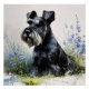 A soft watercolor-style illustration of a calm schnauzer seated among delicate blue wildflowers and meadow grasses, featuring gentle textures, a light neutral background, and a peaceful, natural atmosphere.