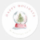 Watercolor Snow Globe with Christmas Tree Holiday Round Sticker. Personalize with your name and greeting.
