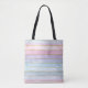 Watercolor stripes in shades of blue, purple, and pink with faux gold stripes between them decorate this reusable tote bag. Great for hauling your summer time gear or for grocery shopping all year. AI generated by IveyCottage.