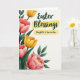 Designed with an off-white background, this card features a lush border of spring flowers and leafy stems curling along the left side and across the bottom 🌷. Sunny yellow and soft coral-pink tulips sit among deep green leaves, their gently shaded petals giving the scene a tender, just-picked look. The open space to the right feels like a quiet pause where the bouquet seems to lean in, as if sharing a close moment with the reader 🐰. In the upper-right area, the words “Easter Blessings” appear in dark green lettering, set over a wide, paint-like yellow brush stroke that makes the message stand out. Just beneath it, “Daughter & Son-in-law” is placed on a second yellow stroke, aligned with the first for a balanced layout. Soft light and subtle color shifts across the petals add depth, while the background stays lightly textured and uncluttered. At the bottom edge, a fully opened coral bloom shows tiny golden stamens at its center, framed by layered petals and dark green stems.