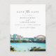 Diese Save the Date Postkarte zeigt ein Aquarellbild der Skyline von Sydney, Australien und eine einfache Postkartenablage für einfaches Mailen.