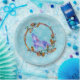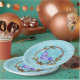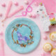 Papier-Teller mit einer grafischen Abbildung, bestehend aus einem lila Wölf, in einer klassischen heulenden Pose. Umgeben von einem illustrierten Kranz aus Holz, Kristallen, Federn und Perlen. Cooles amerikanisches Motiv im boho-Stil.