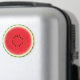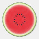 Dieser Untersetzer ist eine saftige Wassermelone-Scheibe mit Rinde, Samen und Samenlöchern. Am Rand ist ein Streifen gestreifter Haut sichtbar.