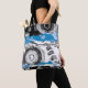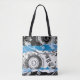 The Wave Mechanism – Custom Tote Bag transforms abstract art into a practical everyday accessory. Symmetrical circular motifs evoke gears in motion, while the bold blue wave band flows across the center, balancing structure with fluidity.