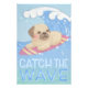 Eine niedliche Abbildung eines Mops auf einem rosa Surfbrett mit Texten "CATCH THE WAVE"