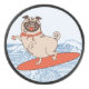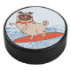 Wave reitet Hund auf Surfbrett mit Happy Mops Eishockey Puck