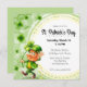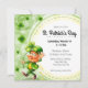 Niedlicher Cartoon Kobold mit einem Kleeblatt und Münzen, die aus seiner Tasche fallen und Gäste zu einem Party einladen. Spaß abstrakter grüner Hintergrund mit Kleeblättern.