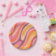 Wavy Loops Retro Abstraktes Muster Rosa Lila Orange Mustard. Trippy 60er 70er 80er psychedelische Ästhetik. Vintage, moderne Farben. Einzigartiges künstlerisches cooles zeitgenössisches, schnörkelloses und schnörkelloses Design, hell, farbenfroh und mit einem fröhlichen Ambiente. Von Kierkegaard Design Studio.
