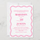 Dieses Wavy Pink Retro Squiggle Wedding Invitation verbindet lebendige Rosa und Rot mit spielerischen Kurven und Squiggles für eine einzigartige Retro Hochzeitsvibe. Das zeitgenössische Design besticht durch stilvolle Kalligraphie und bietet eine frische, aber nostalgische Drehung für traditionelle Hochzeitsfeiern. Ideal für Paare, die eine gewagte, gewagte Hochzeitseinladung gewollt haben, die sich durch ihren modernen Flair und den Retro-Charme auszeichnet.