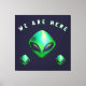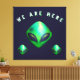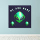 Cool fun canvas print with a printed image of 3/three green alien heads on a very dark blue background, with a caption/phrase which reads "WE ARE HERE"