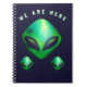 Cool fun note book with a printed image of 3/three green alien heads on a very dark blue background, with a caption/phrase which reads "WE ARE HERE"