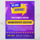 Looking to hire top talent and make a splash while doing it? This bright, eye-catching “We Are Hiring” flyer template in bold blue, purple, and yellow colours is perfect for announcing open positions within your company. Fully editable, you can customize the job title, description, qualifications, and application details, and even reword the playful “We Are Hiring” bubble to highlight any announcement you want. Ideal for recruitment marketing, job postings, internal hiring announcements, or social media and print use, this fun, modern flyer makes attracting the right candidates easy and stylish!
