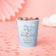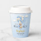 Diseño de Vasos para Baby Shower ccon una Hermosa Tematica de Oso en acuarela volando en una canasta con globos azules y blancos y la frase"WE CAN BEARLY WAIT" con linda tipografia en color negro y un fondo azul con nubes blancas alrededor!.. Se puede personalizar con el nombre de tu bebe.