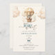 We Can Bearly Wait Teddy Bear Balloon Baby Shower Invitation. Get ready for a sky-high celebration with this charming baby shower invitation! A lovable boho teddy bear embarks on a journey in a beautifully illustrated hot air balloon, set against a backdrop of fluffy clouds and scattered stars. The artistic watercolor effect adds a touch of vintage rustic charm and a soft, dreamy aesthetic, ideal for a boy baby shower. This invitation sets a playful and whimsical tone, inviting guests to share in the joy of a new chapter .It's the perfect way to invite loved ones to celebrate this special journey. Add custom details on back like a custom QR code for registry details.