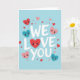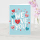 This card features the large message “WE LOVE YOU” centered in bright white with a soft shadow, standing out against a wide sky-blue background. Around the words, a group of smiling heart characters in red, light pink, and teal gather like close friends, their wide eyes and gentle grins giving the scene a sweet, affectionate energy 🥰. Some hearts lean slightly toward the lettering, as if drawn in by the message, adding a quiet sense of togetherness ❤️. Smaller hearts are sprinkled across the space like tiny confetti, filling the open sky with little sparks of love. The overall setting stays simple and airy, with plenty of blue breathing room that makes the characters and text feel front and center. The main text sits in the middle, while the heart faces cluster around it to frame the phrase without covering it. A few mini hearts float near the edges, and the teal and pink accents balance the reds across the blue field.