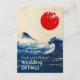 eine vertikale Kapselkarte für die Hochzeitsdetails, elegant als Teil der exquisiten japanischen Harmonie mit Fuji Kollektion entworfen. Die Vorderseite zeigt anmutig die Namen des Ehepaares Emily und Michael in einer harmonischen Mischung aus neugierigen und mutigen Schriftart. Eine atemberaubende Abbildung des Fuji erhebt sich majestätisch im Hintergrund, mit seinem schneebedeckten Set vor den ruhigen, blauen und weißen Wellen, die durch kräftige rote Striche hervorgehoben werden. Wenn Sie die Karte gedreht haben, geht das gleiche atemberaubende Design von vorne weiter und bietet ein zusammenhängendes visuelles Erlebnis. Hier finden Sie den passenden Text, in dem Sie alle wichtigen Informationen wie Unterkunft, Transport oder andere Details, die Ihre Gäste benötigen, hinzufügen können. Es gibt auch einen praktischen QR-Code, der Ihre Gäste mühelos auf die Hochzeitswebsite bringt, um sicherzustellen, dass sie alle Informationen zur Hand haben. Wenn Sie es vorziehen, können Sie den QR-Code und die Website-Adresse auf der Seite löschen. Diese Karte dient nicht nur als praktischer Leitfaden für Ihre Gäste, sondern auch als künstlerischer Sake, der traditionelle japanische Ästhetik wunderbar mit modernen Hochzeitsessenziellen verbindet.