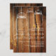 Eine einfache rustikale Landhochzeitseinladung mit einem beunruhigten Druckhintergrund und -Weckgläsern der Scheune hölzernen, die von der Spitze der Einladung hängen.