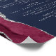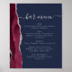 Ein elegantes Zeichen für Ihr Hochzeitsmenü. Die Worte "Bar menu" erscheinen in silbergrauer Handschrift Kalligrafie mit Swashes am Anfang und Ende, mit anpassbarem Text unten. Ein bordeauxrotes Aquarelldesign mit silberfarbenem Glitzer aus Imitat schmückt den links Rahmen auf marineblau Hintergrund. In unserer Kollektion finden Sie die passende Hochzeitseinladung und das Tagesgeschäft.