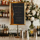 An elegant sign for your wedding bar menu. The words "bar menu" appears in gold-colored handwriting calligraphy with swashes at the beginning and end, with customizable text below. A burnt orange watercolor agate design trimmed with gold faux glitter decorates the left border on a slate black background. See our collection for matching wedding invitation suite and day-of stationery.