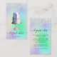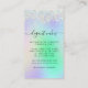 This elegant bakery business card features a silver and iridescent rainbow wedding cake illustration on a faux holographic background, with a top border of silver faux glitter. Customize it with your business name in black handwriting script with swashes at the beginning and end, and your contact information in black sans serif font. (To keep the swashes, replace only the letters in those text fields, leaving the symbols in place.)