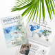 Modernes und elegantes World Map Einladung Hochzeitsziel, wie Pass. Strand mit tropischen Palmen, Aquarellbilder