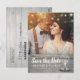 Save the Date Hochzeit Einladung Foto Postcard Vorlagen - Elegantes Schreiben, Vintage Champagner Brillen und String Lights auf rustikalem Holzhintergrund. Ein perfektes Design für Ihren großen Tag! Alle Textstile, Farben, Größen können an Ihre Bedürfnisse angepasst werden.