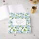 Non-Foil Dieses Gästebuch wird in einem romantischen blauen Hydrangea-Druck gezeigt. Weiße Seiten mit Zeilen. Personalisieren Sie dieses Buch und passen Sie es weiter an, indem Sie die Beispielnamen und das Datum an Ihre ändern. Lizenziertes Bild