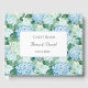 Non-Foil Dieses Gästebuch wird in einem romantischen blauen Hydrangea-Druck gezeigt. Weiße Seiten mit Zeilen. Personalisieren Sie dieses Buch und passen Sie es weiter an, indem Sie die Beispielnamen und das Datum an Ihre ändern. Lizenziertes Bild