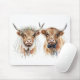 Two highland cows dressed in wedding attire, one adorned with a floral headdress and veil, and the other sporting a bow tie, are illustrated in a whimsical watercolor style