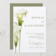 This wedding invitation features a sophisticated, minimalist style. Delicate calla lilies in soft green hues are depicted against a light background, creating an atmosphere of sophistication and tranquility. The design is modern, airy, and perfect for a stylish, romantic wedding.