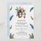 Wedding invitation featuring tropical flowers and colorful feather accents on a textured background. Details in elegant script and bold type.