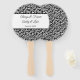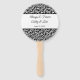 Dieser Hochzeitspaddle-Fan wird mit einem eleganten schwarz-weißen Damast-Druck und Beispielnamen und Datum gezeigt. Passen Sie dieses Element an, und ändern Sie Namen und Datum nach Bedarf.