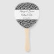 Dieser Hochzeitspaddle-Fan wird mit einem eleganten schwarz-weißen Damast-Druck und Beispielnamen und Datum gezeigt. Passen Sie dieses Element an, und ändern Sie Namen und Datum nach Bedarf.
