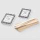 Dieser Hochzeitspaddle-Fan wird mit einem eleganten schwarz-weißen Damast-Druck und Beispielnamen und Datum gezeigt. Passen Sie dieses Element an, und ändern Sie Namen und Datum nach Bedarf.