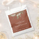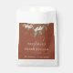 This design features a terracotta wedding candy favor paper bag template with elegant floral greenery, a stylish trendy calligraphy script, with classic simple minimalist ampersand typography lettering, wedding bride and groom names, a simple white flower leaves foliage, a wedding party reception treat favor, a wedding guest cookies bars desserts, a simplistic elegance rust earth tones, a minimalist minimal classic traditional, a creative stylish wedding décor.