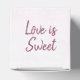 Rosa Blume mit grünem Efeu-Bouquet auf weißem Satin-Band-Herz auf weichem rosa und weiß abstraktem Muster. Namen und Hochzeitstermin können bearbeitet werden.