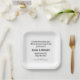 Die Square Paper Plate der Elegance Collection - eine einzigartige humorvolle Ergänzung zu Ihren Hochzeitsfestlichkeiten. Diese quadratische Papiertafel wurde mit einer klaren und modernen Ästhetik gestaltet und enthält eine witzige und individuell anpassbare Aufschrift: "Betrachten Sie diese Teller als Ihre offizielle Eintrittskarte zum großen Fest der glücklichen Zeit danach. Viel Spaß mit der Show!" Das Design zeigt einen weißen Hintergrund mit elegantem schwarzem Text. Die zentrale Spaß-Inschrift verleiht Ihrer Hochzeitsfeier eine Touch von Begeisterung und schafft so ein leichtes und unterhaltsames Ambiente für Ihre Gäste. Unterhalb der Inschrift werden die Namen der frisch verheirateten Paare elegant angezeigt, wodurch eine personalisierte Touch hinzugefügt wird. Zusätzlich sind das Zeremoniedatum und die Einzelheiten zum Veranstaltungsort enthalten, können aber bei Bedarf gelöscht werden. Das geschmackvoll gestaltete Square Paper Plate aus der Elegance Collection bietet Ihnen eine reizvolle Touch in Ihre Hochzeitstischeinstellungen. Seine individuell gestaltbaren Elemente machen es einzigartig und sorgen für eine harmonische Integration mit der Eleganz und Freude Ihrer Hochzeitsfeier