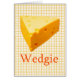 Gelber karierter Hintergrund mit einem Block des Käses, beschriftet Wedgie