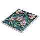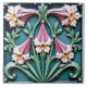 A square tile with a floral design in relief, featuring a symmetrical arrangement of stylized flowers and foliage in a palette of teal, pink, and cream. The background is a deep teal, providing a contrast to the lighter elements. The design includes four large, cream-colored flowers with yellow centers, positioned at the corners of the tile. Between these flowers are stylized pink bell-shaped flowers, flanked by green leaves and stems that create a sense of vertical movement.