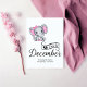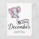 Adorable Baby Girl Elefant mit rosa Polka Dot Ohren und winziger rosa Bogen über dem Ohr, "Due in December" Typografie, und Vorlage für besondere Nachricht Ankündigung der Schwangerschaft.