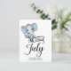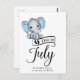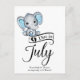 Adorable Baby Boy Elefant mit blauen Polka Dot Ohren, "Due in July" Typografie, und Vorlage für besondere Nachricht Ankündigung der Schwangerschaft.