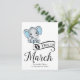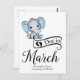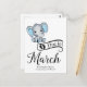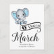 Adorable Baby Boy Elefant mit blauen Polka Dot Ohren, "Due in März" Typografie und Vorlage für besondere Nachricht Ankündigung der Schwangerschaft.