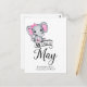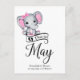 Adorable Baby Girl Elefant mit rosa Polka Dot Ohren und winziger rosa Bogen über dem Ohr, "Due in May" Typografie, und Vorlage für besondere Nachricht Ankündigung der Schwangerschaft.