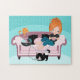 Ein wunderbarer 11" x 14" Puzzle-Cartoon von einer Dame und ihren Katzen, die weglaufen.