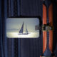 Segelboot ab der kalifornischen Küste am Huntington Beach mit der Silhouette der katalanischen Insel im Hintergrund.