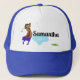 Weibliche Golfer, die über Wassergefahr fahren Truckerkappe