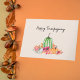 Diese hübsche Erntedank Grußkarte zeigt eine zarte Aquarellillustrierung von Kürbissen und lebendigen Blume in sanften, femininen Tönen. Die Mischung aus grün, orange und cremefarben verleiht dem Design ein frisches und stilvolles Ambiente, das perfekt ist, um Ihre Urlaubswünsche mit Eleganz auszudrücken. Diese Grußkarte erfasst die Schönheit des Herbstes und macht sie zu einer durchdachten Art, die Wärme des Erntedanks mit Freunden und Familie zu teilen.