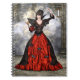 3D digitale Darstellung eines schönen weiblichen Zauberers in einem roten und schwarzen Kleid mit Flügeln auf einem fantasievollen Schlosshintergrund