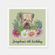 Desteis originelle Cartoon-Illustration eines niedlichen, mit weichem Überzug bedeckten Hundes, nah aufgereiht, umgeben von bunten Wildblumen im Sommer. Es gibt eine rot-rosa Blume, eine lila Blume, eine dunkelrosa Blume und eine weiße, dunkle Blume mit grünen Blätter und Ästen. Die Hintergrundfarbe ist grün mit einem hellen Polka-Punktmuster. Die Hintergrundfarbe kann auf eine andere Farbe geändert werden, und das Polka Punktmuster kann nach Wunsch entfernt werden. Es gibt auch einen personalisierbaren Textbereich.