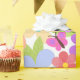 Mit diesem niedlichen und skurrilen Verpackungspapier wackeln Sie Ihre Geschenke auf eine ganz besondere und farbenfrohe Art und Weise. Orangefarbene, rosa, lila und gelbe Blumen, lebendige Blätter und Schmetterlinge prägen das Muster.